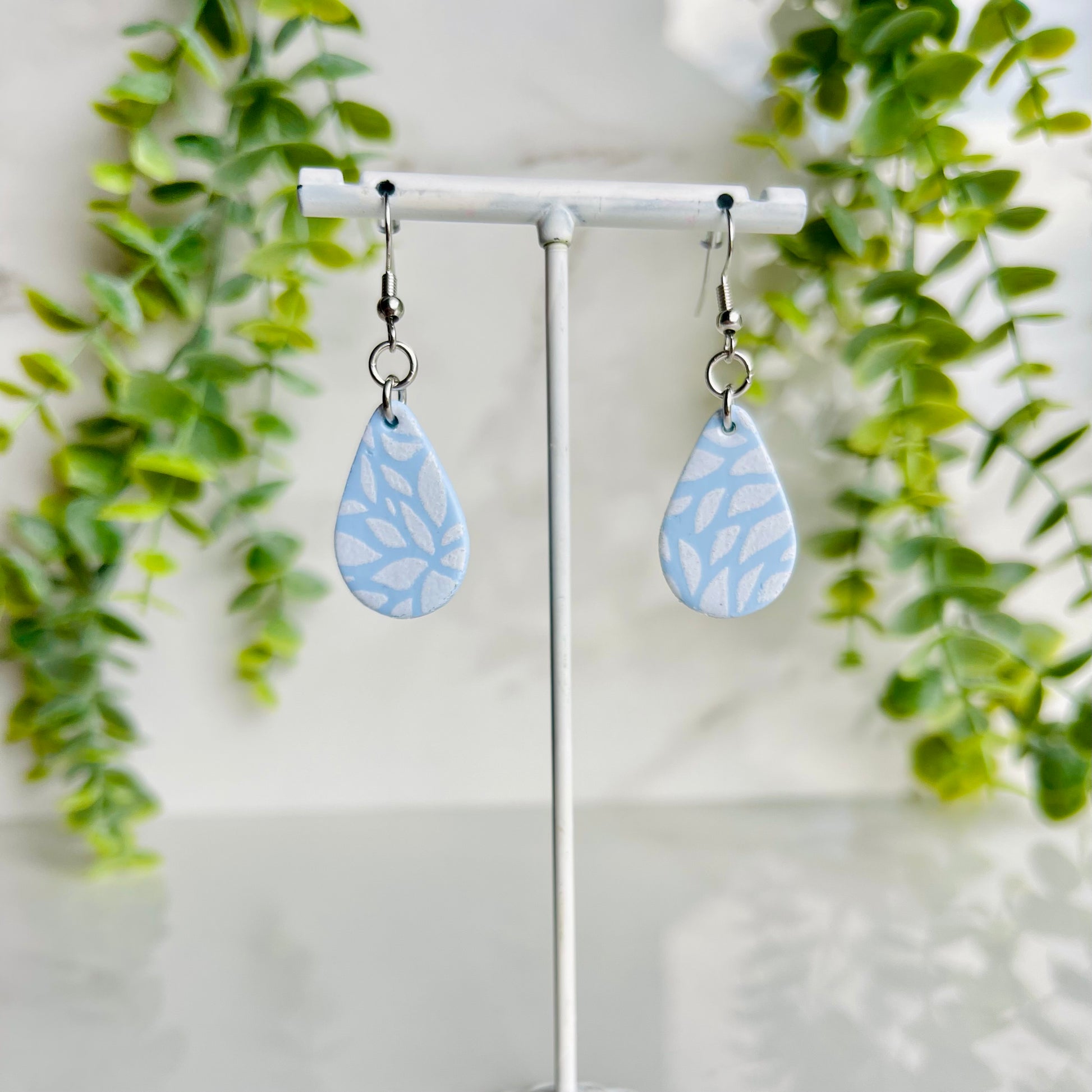 Add a touch of elegance to your everyday look with the Caroline Teardrops earrings. These small, light blue teardrop earrings feature a delicate white painted pattern, adding a subtle yet sophisticated touch to any outfit.