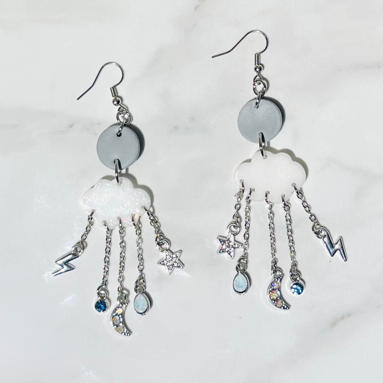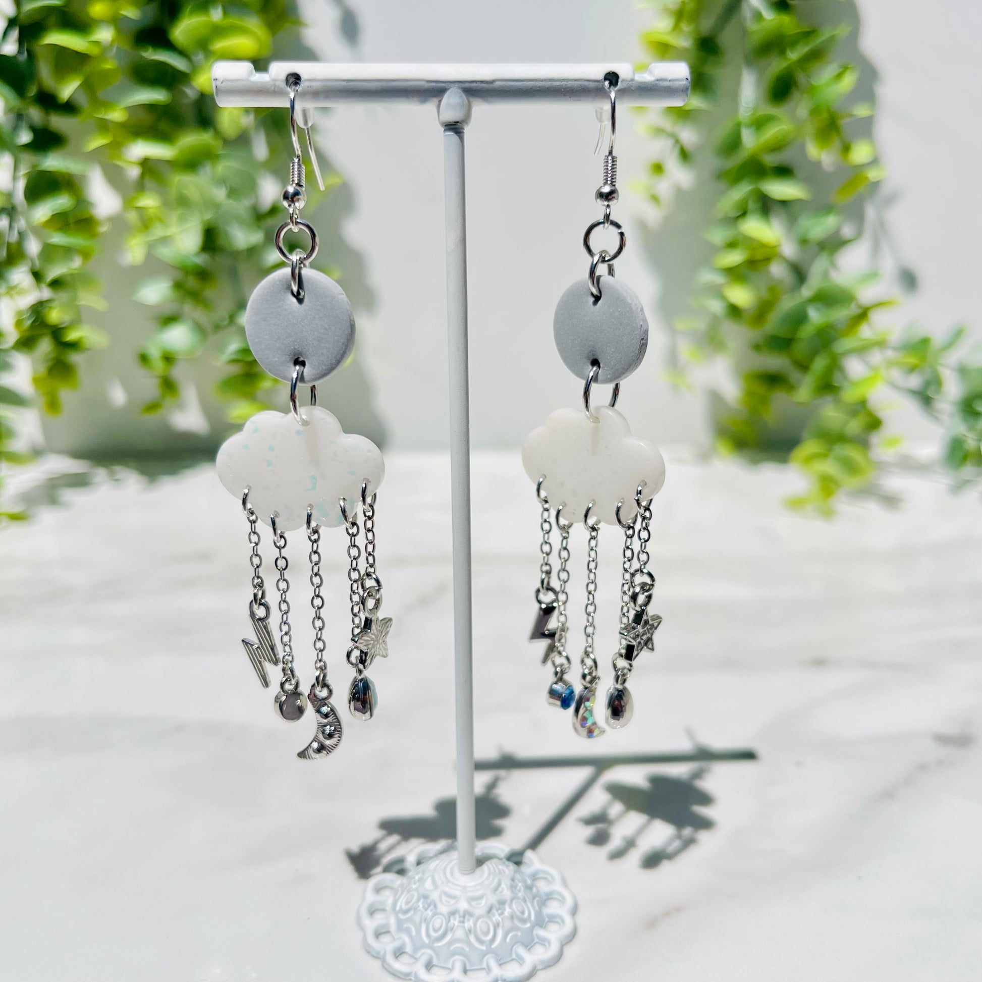 Introducing April Showers - chic and whimsical sparkly cloud earrings with dangling charms to look like rain. Lightweight and comfortable to wear, these earrings add a touch of playful fun to any outfit. Perfect for those who enjoy unique accessories with a hint of sparkle.