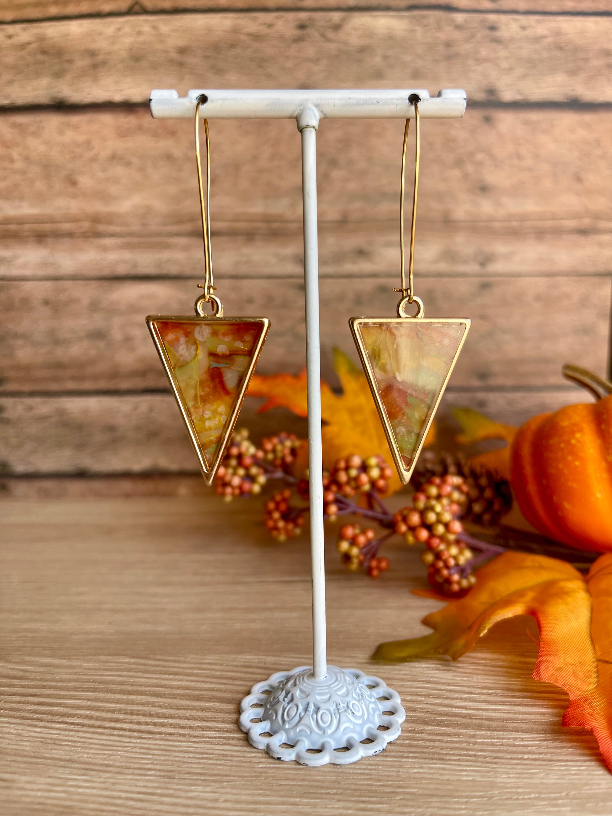 These translucent Charlotte earrings feature a unique gold accent triangle design filled with a stunning clay marble pattern in rich fall colors. Elevate any outfit with these elegant and eye-catching earrings.