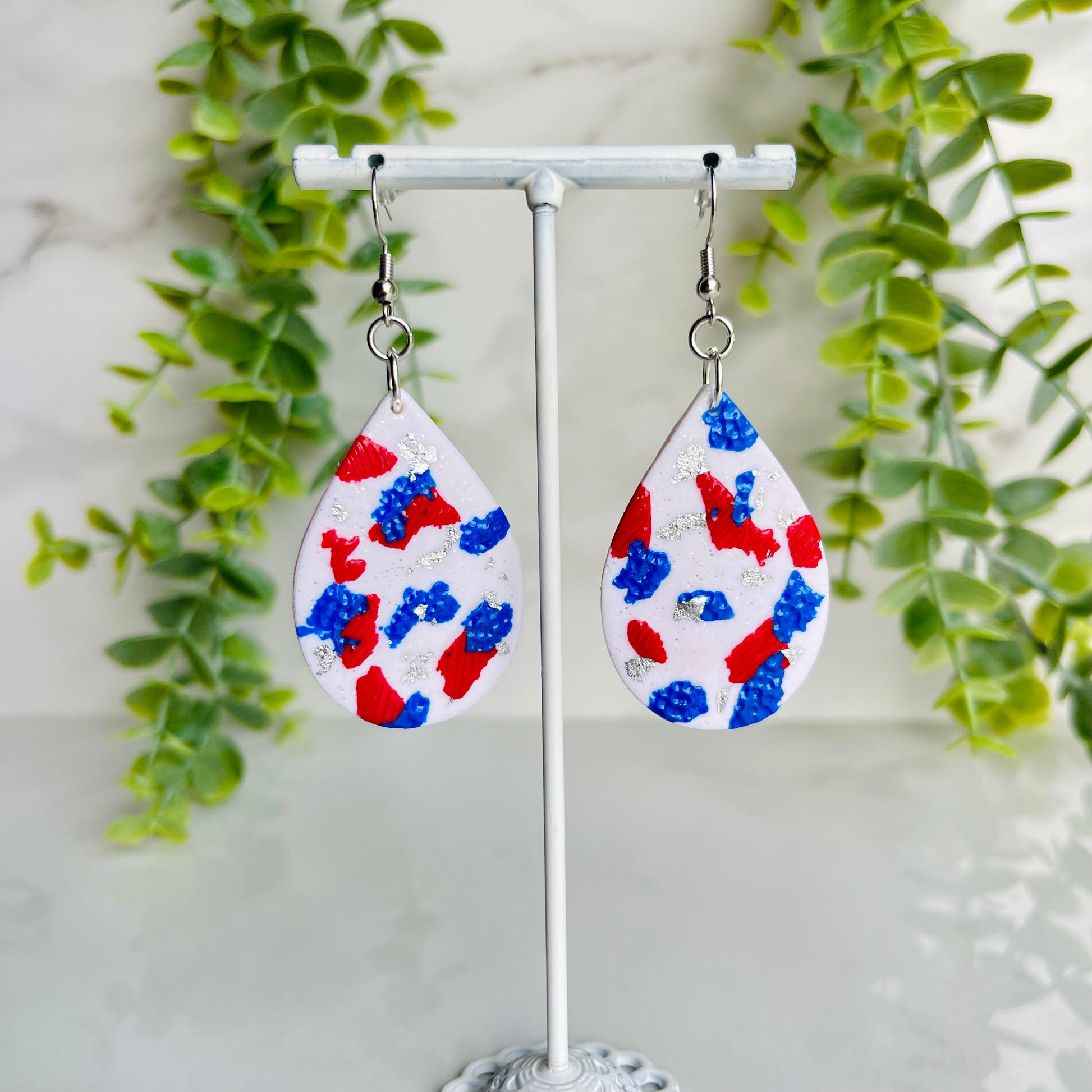 Introducing Liberty - the perfect accessory for patriotic fashionistas. These dangle teardrop earrings feature red, white, and blue clay with silver foil accents Stand out with style and show your love for the USA.